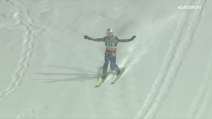 Reprezentant Słowenii najlepiej poradził sobie w trudnych warunkach i po rewelacyjnie, mimo miękkiego śniegu, wylądowanym skoku na 137 metr w drugiej serii wygrał z dużą przewagą