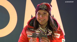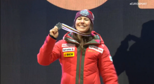 Niesamowicie elektryzujące trybuny i okolice trasy stały się jeszcze bardziej energiczne, gdy z bramki startowej jako przedostatnia do walki o ZŁOTO przystąpiła kolejna była Mistrzyni Świata, Katharina LIENSBERGER. 27-latka od pierwszego pomiaru traciła do Wendy, ale nie popełniała ogromnych błędów, wytrzymywała presję. Na przedostatni sektor wjechała z już większą stratą i było wiadome, że na linii mety będzie bardzo blisko Reprezentantek USA. Te przypuszczenia się sprawdziły – Katharina wjechała na metę o 0,02 oraz o 0,05 sekundy PRZED Paule i Mikaele, co oznaczało wielką euforię ponad 20 tysięcy widzów – Katharina była bowiem pewna zdobycia medalu!
