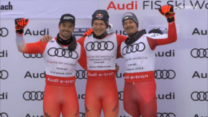 Równo o 13:15 ruszyło przyznawanie nagród za klasyfikację zjazdową, w której po raz pierwszy w karierze triumfował Marco ODERMATT. Za nim z stratą 42 punktów uplasował się fantastyczny Cyprien SARRAZIN, a trzecią lokatę wywalczył Dominik PARIS.