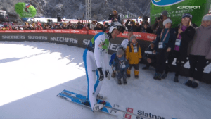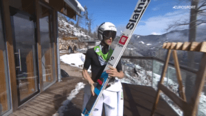 I tak też się stało. PERO po chwili ruszył i wszyscy wstrzymali oddech. Pero bardzo zaryzykował, widać było pewne turbulencje w powietrzu, ale doleciał na ŚWIETNĄ ODLEGŁOŚĆ, 226,5 METRA. Mimo nie przekroczenia 230 metra i tak oczywiście zagrano muzykę PLANICY, a na dole już czekała cała rodzina (oprócz Domena) oraz koledzy z kadry.