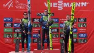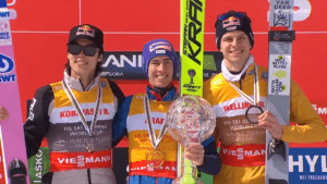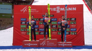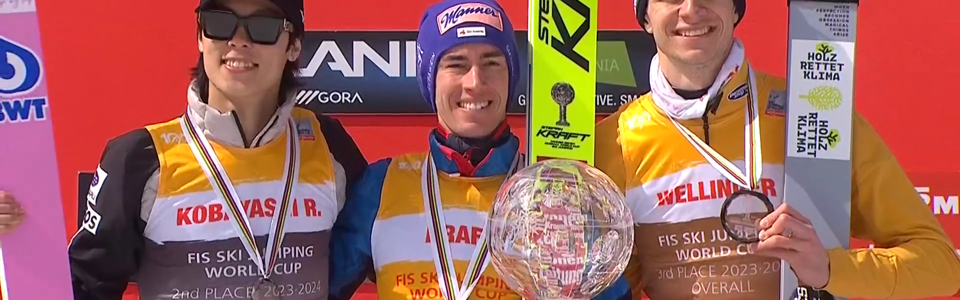 Za parę minut doszło do ostatniej ceremonii indywidualnej, tej najważniejszej, a więc wręczenia nagród za całą zimę. Pierwszy na podium wszedł Andreas WELLINGER, potem Ryoyu KOBAYASHI, a na koniec Stefan KRAFT.