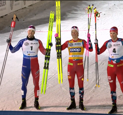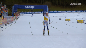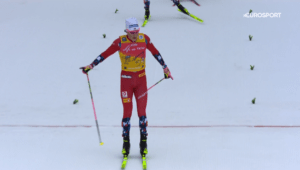 O wszystkim decydowały ostatnie kręte zjazdy i ostatni podbieg już na stadionie. A to po raz kolejny rozegrał PERFEKCYJNIE JOHANNES KLAEBO. Norweg fantastycznie zjechał i na podbiegu wyrobił sobie kilkanaście metrów przewagi. A z tyłu sensacja – od reszty grupy oderwał się SINDRE SKAR, sprinter który fantastycznie biega teraz również dystanse i Federico PELLEGRINO, który trochę zaspał w momencie ataku J.Klaebo, ale na tym podbiegu minął rywali jak chciał i wyszedł na 3 lokatę.
