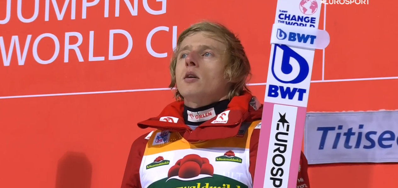 Po triumfie w kwalifikacjach Dawida czekaliśmy jeszcze bardziej na początek konkursu. Początkowo przebiegał on bardzo sprawiedliwie, ale niestety po przerwie po 30 numerze (M.Hayboeck, który skoczył bardzo dobrze) warunki się zmieniły. Wiatr przestał praktycznie całkowicie wiać, a belka pozostała na bardzo niskim poziomie. Niestety pierwszą ofiarą był Kamil Stoch, który w takiej sytuacji nie awansował do 2 serii. Spotkało to też kolejnych – Aschenwalda, Giovanniego Bresadole, Hoerla, Petera Prevca, Wellingera oraz Mariusa Lindvika. Kilku kolejnych awansowało, ale było bardzo daleko w tej 30-stce. Piotr Żyła był pierwszym, który wreszcie po przerwie przekroczył 130 metr. A lepszy skok od prowadzącego ciągle Hayboecka oddał dopiero Granerud!!! Bardzo dobrze również skoczył Anze Lanisek i to oni prowadzili przed skokiem Dawida. Nasz lider PŚ jednak popełnił błąd za progiem i skoczył 130,5 metrów, co dało 5 lokatę.