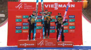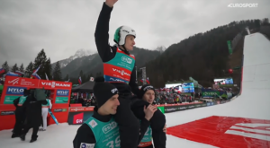 Po chwili tak jak wszyscy w to piątkowe po południe, bez żadnego czekania na belce z belki ruszył kończący konkurs Anze LANISEK. 28-letni Reprezentant Słowenii skacząc w praktycznie takich samych warunkach jak Domen skoczył aż o 10 metrów bliżej, co oznaczało jedno – Domen PREVC wygrywa 3 konkurs w tym sezonie i ZAPEWNIA SOBIE MAŁĄ KRYSZTAŁOWĄ KULĘ ZA LOTY NARCIARSKIE! Anze po raz kolejny w tym sezonie mimo prowadzenia na półmetku nie wygrał, ale ostatecznie spokojnie z ponad 10 punktową przewagą zajął 2 miejsce, co oznaczało DUBLET dla gospodarzy. Po oficjalnym ogłoszeniu wyników Lovro KOS i Timi ZAJC podnieśli Domena na ramionach i wykonali z nim kilka metrów przed kibicami!