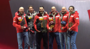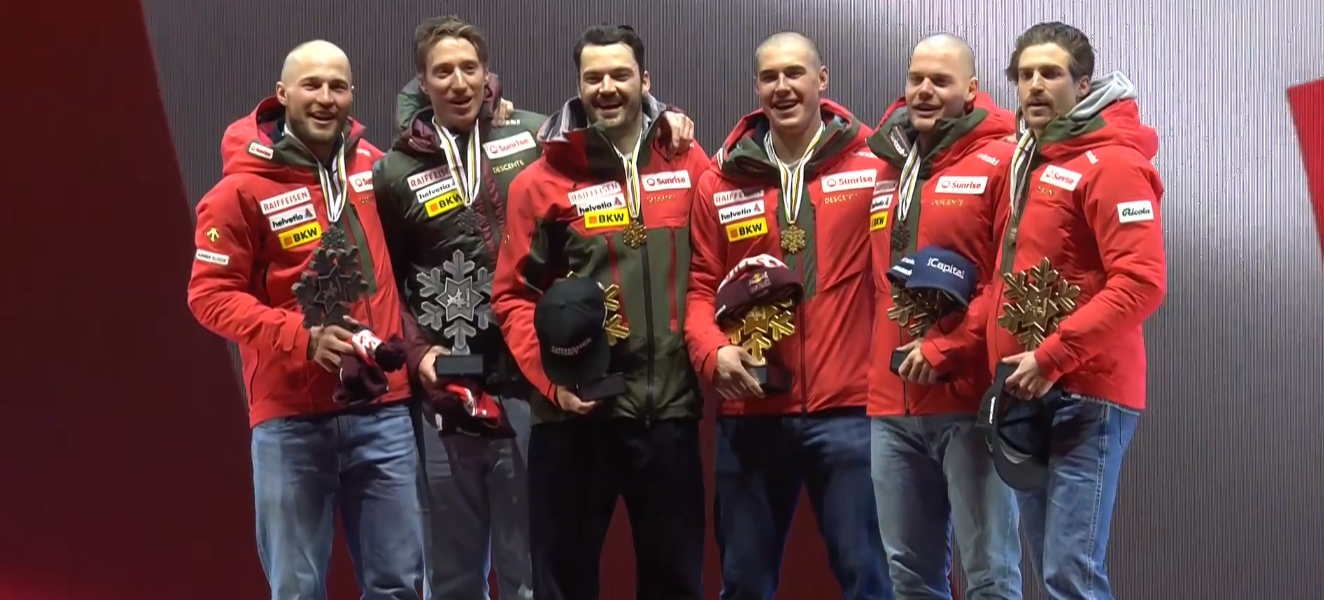 Po chwili wyniki stały się oficjalne – SZWAJCARIA wzięła WSZYSTKIE MEDALE W DRUŻYNOWEJ KOMBINACJI ALPEJSKIEJ MĘŻCZYZN! Za parę minut odbyła się Ceremonia Tortowa, na której również odegrano hymn.