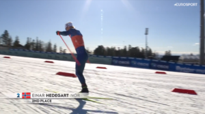 Po rozpoczęciu drugiego okrążenia i pokonaniu pierwszego podbiegu 2 pętli nadal najszybszy był Einar HEDEGART. Najwięksi faworyci biegli jednak praktycznie identycznie i w 2 sekundach straty do byłego biathlonisty mieściła się 4 graczy – Johannes, Harald, Andreas i Iver. Około 3 sekundy więcej tracił w tym momencie William POROMAA, a już zdecydowanie więcej, bo kolejne 10 sekund z tyłu byli Hugo LAPALUS i Paal GOLBERG. O wiele słabszy bieg niż w sobotę kontynuował Martin NYENGET, który na razie był klasyfikowany poza TOP10.