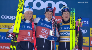 Harald Oestberg AMUNDSEN odniósł tym samym 6 wygraną w tym sezonie, a 10 w karierze, pierwszą od rozgrywanego 2 lutego biegu w COGNE. W swoim 2 starcie w PŚ w BIEGACH NARCIARSKICH na podium stanął Einar HEDEGART, a zadowolony z 3 miejsca na dużym zmęczeniu w biegu na czas był Johannes KLAEBO, dla którego było to 13 podium w tym sezonie.