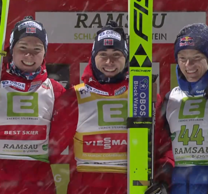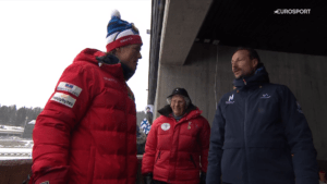 Na ostatniej pętli, którą kombinatorzy kończyli tegoroczną rywalizację na tych słynnych trasach Jarl Magnus RIIBER miał czas na małe pozdrowienia dla kibiców, a na ostatniej prostej również dla Króla Haakona.