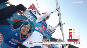 Cały 2,5 godzinny konkurs kończył Jan HOERL. Austriak kilkukrotnie trochę w drugiej serii nie wytrzymał napięcia, ale tym razem wszystko wykonał perfekcyjnie – skoczył 127,5 metra, a przecież miał 10 punktów zaliczki! Po chwili oczekiwania na oficjalne potwierdzenie na telebimie 25-latek wpadł w szał radości wraz z kolegami, którzy wzięli go na ramiona!!! Jest to druga wygrana w karierze Mistrza Olimpijskiego z drużyny.