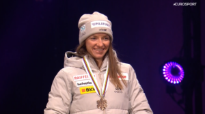Kristine trzymała się Jonny aż do końcówki ostatniej, trzeciej części wzniesienia, kiedy to musiała odpuścić, by nie stracić 2 lokaty. Jonna SUNDLING pewnie zjechała przed wielką trybunę, bezpiecznie pokonała ostatni, grząski zakręt i pozdrawiając publiczność na trybunie głównej, w tym Króla Szwecji przekroczyła linię mety na pierwszym miejscu!!! Z tyłu Nadine FAEHNDRICH zbliżyła się do Kristine SKISTAD, która jednak nie wypuściła srebra z rąk i przy ogromnym dopingu sięgnęła po pierwszy medal MŚ! Reprezentantka Szwajcarii, która ostatecznie była trzecia również nie ukrywała radości z pierwszego indwidualnego medalu!!!