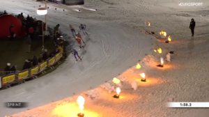 Jak zawsze już w pierwszym wyścigu udział wziął Johannes KLAEBO. 6-krotny Mistrz Świata od startu kontrolował stawkę, dobrze prezentując się zarówno na podbiegu jak i rozpoczynającym sie obok pomnika zjeździe, wzdłuż którego podczas przejazdu zawodników zapalał się ogień.