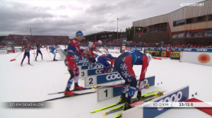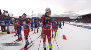 Po ukończeniu 3 pętli, którą zawodnicy pokonywali w otoczeniu kilkunastu tysięcy widzów, którzy byli obecni w całym lesie, na 10 kilometrze doszło do ZMIANY NART. Najszybciej przeprowadzili ją Reprezentanci Francji, a pierwszy na trasę stylem dowolnym wybiegł Hugo LAPALUS.