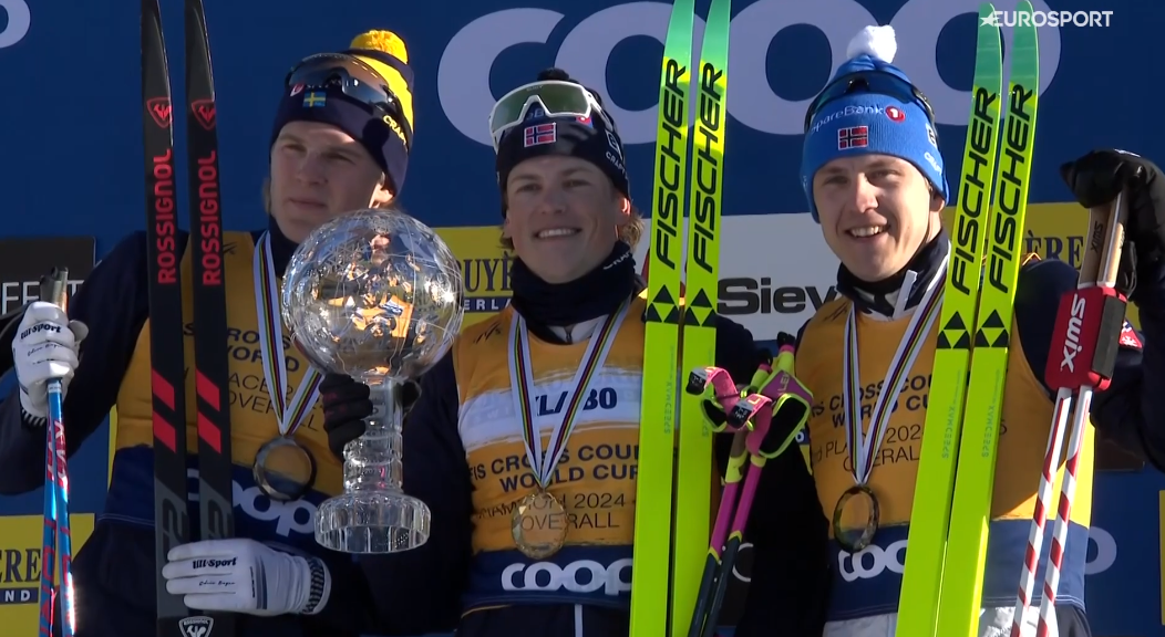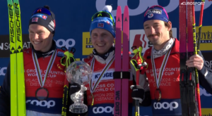 Po kilku chwilach odbyły się ostatnie, kończące sezon CEREMONIE. Najpierw wręczono nagrody za dzisiejszy bieg, a następnie wręczono przystąpiono do CEREMONII za Klasyfikację GENERALNĄ. Kryształowe Medale za 2 i 3 miejsce odebrali Edvin ANGER oraz Erik VALNES, a oprócz medalu dużą, 5 w karierze Kryształową Kulę odebrał Johannes KLAEBO, który usłyszał hymn NORWEGII.