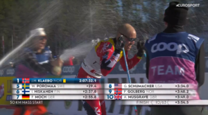 Po kilku kolejnych sekundach TOP10 uzupełnili Paal GOLBERG i Andrew MUSGRAVE. Dziewiątego dziś na mecie Paala przywitali Francuzi, którzy jako pierwsi przywitali go szampanem! Następnie Paala przytulił Johannes KLAEBO, który po chwili otworzył kolejną butelkę szampana i sam polał kończącego wielką, długą karierę Paala GOLBERGA.