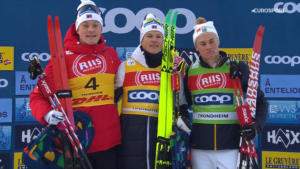 Wszystko rozstrzygnęło się na końcu długiego podbiegu, kiedy to Jonna Sundling popełniła błąd i zaliczyła upadek. Kilkukrotna Mistrzyni Świata oraz aktualna Mistrzyni Olimpijska szybko ruszyła w pościg za rodaczkami, ale na podium wedrzeć się nie zdołała.