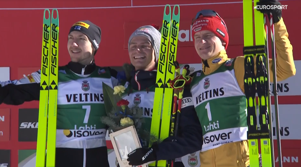 Po około pół minucie na metę przy radości kibiców dotarł Ilkka HEROLA, a po kolejnych 15 sekundach linię mety na 3 miejscu przekroczył Julian SCHMID. Już po kolejnych 10 sekundach na mecie pojawił się Vinzenz GEIGER, co oznaczało, że do podium mimo ogromnej straty 2 minut liderowi PŚ zabrakło niewiele.