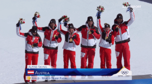 Nadszedł czas na WIELKI FINAŁ o Złoto Olimpijskie. Niemcy objęły prowadzenie po triumfie Leny Duerr, 4 slalomistki Igrzysk nad Kathariną Truppe. Jednak potem po dziwnej decyzji trenera Niemców o wstawieniu za Strassera młodego Rauchfussa przegrali łatwo 2 pojedynek i doszło do remisu. W 3 parze Aicher nie wytrzymała nerwów i Liensberger łatwo wyprowadziła AUT na prowadzenie. Alexander Schmid musiał wygrać z bardzo dobrym czasem. Część zadania spełnił, pokonał Johannesa Strolza, ale był za wolny!! AUSTRIACY MISTRZAMI OLIMPIJSKIMI w składzie Truppe, Liensberger, JOHANNES STROLZ dla którego to 3 medal (jedyny Alpejczyk z tyloma medalami), Brennsteiner oraz rezerwowi Michael Matt i K.Huber. Niemcy odebrali i tak zadowoleni srebra, jedyne medale Alpejskie w składzie Duerr, Aicher, Strasser, Schmid i Rauchfuss, jako jedyni wystawili do jazdy 5 graczy.