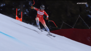 W pewnym momencie była bardzo utraty kontroli nad nartami – uderzyła bowiem w tyczkę, która po tym wyleciała do góry i prawie uderzyła kamerującego przejazd drona.
