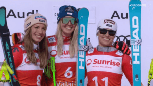 Faworytka gospodarzy, pochodząca z tych okolic pojechała najlepiej od VAL D’ISERE. Do przedostatniego odcinka minimalnie traciła do Austriaczki. Końcówkę pojechała bez takiego błędu, jaki miał miejsce u Cornie i na linii mety osiągnęła taki sam czas!