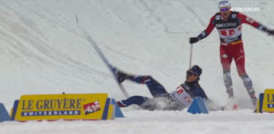 Na przedostatnim okrążeniu, a więc ostatniej zmianie rozpoczynających doszło do upadku na czele stawki – na samym końcu zjazdu na stadion upadł Jules CHAPPAZ, którego ledwo zdołał ominąć Paal GOLBERG.