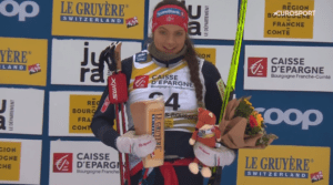 Drugie miejsce wyrwała biegnąca z ostatnim numerem DELPHINE CLAUDEL. Francuzka, która wygrała na Alpe d’Cermis po raz pierwszy stanęła więc na podium normalnego biegu!