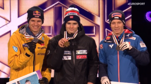 Marius LINDVIK nie mógł więc skoczyć na luzie i musiał skoczyć około 104 metry, by skutecznie odpowiedzieć Andiemu. Po chwili na sygnał od trenera 26-latek ruszył w intesywnym deszczu w dół najazdu. Po fantastycznym odbiciu Marius długo unosił się w powietrzu i ostatecznie wylądował fantastycznym telemarkiem na 104,5 metrze!!! Od razu na dół wyszli wszyscy Reprezentanci NORWEGII, USA oraz Artti AIGRO. Po kilkunastu sekundach powtórek wszystko było jasne – MARIUS LINDVIK ZOSTAŁ MISTRZEM ŚWIATA NA SKOCZNI NORMALNEJ!!! Szybko pogratulowali mu również zadowoleni Andreas WELLINGER oraz Jan HOERL, który jako jedyny z Reprezentacji AUSTRII stanął na wysokości zadania.