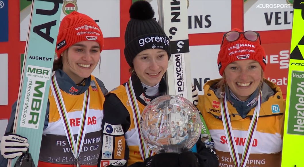 Po kilku minutach od zakończenia zmagań na dole Skoczni Normalnej odbyły się CEREMONIE – najpierw dzisiejszego konkursu, a następnie Klasyfikacji Generalnej. Podczas niej Kryształowe Medale odebrały Katharina SCHMID oraz Selina FREITAG, a Nika PREVC oprócz niego otrzymała piękną, dużą Kryształową Kulę! Po chwili odegrano hymn Słowenii.