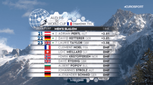 Pierwszy przejazd ostatnich zawodów przed MISTRZOSTWAMI ŚWIATA poszedł idealnie po myśli Clementa NOELA. Triumfator ostatniego slalomu, MISTRZ OLIMPIJSKI prowadził o 0,15 sek przed Ramonem ZENHAEUSERNEM, a o 0,17 sek przed Danielem YULE.