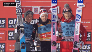 I wtedy weszła do gry TRÓJKA. Pierwszy ruszył ANZE LANISEK – 150 METRÓW z TELEMARKIEM i ogromna przewaga prawie 20 punktów nad Kraftem!!! DAWID odpowiedział mu bardzo podobnie – 147 metrów i pewne 2 miejsce, 10 punktów przed Austriakiem.