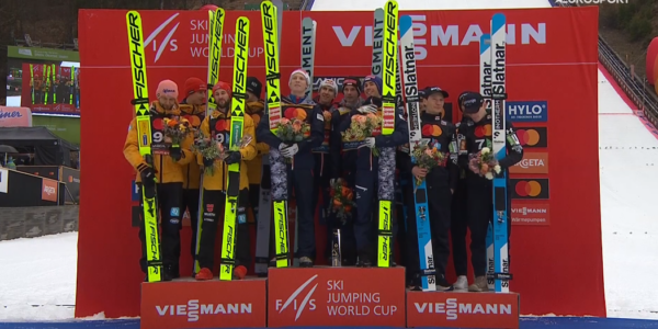 W trzyseryjnej rywalizacji na Wielkiej Krokwi Jan Hoerl i Stephan Embacher nie dali szans rywalom i z wyraźną przewagą pokonali Timiego Zajca oraz Anze Laniska.
