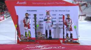 Jako ostatni na trasę w SCHLADMING kilka minut przed 22:00 wyruszył walczący Linus STRASSER. 32-letni Reprezentant Niemiec nie popełniał błędów, ale jeszcze przed wjazdem na ściankę jechał ze stratą do Timona i Manuela. Linus wydawało się, że jedzie po 3 miejsce, ale na ostatnim sektorze stracił jeszcze kolejne setne sekundy i na metę przed tysiące widzów wjechał z stratą 0,77 sekundy! To spowodowało euforię kibiców i każdego z trójki na podium. Każdemu z nich Linus od razu pogratulował.