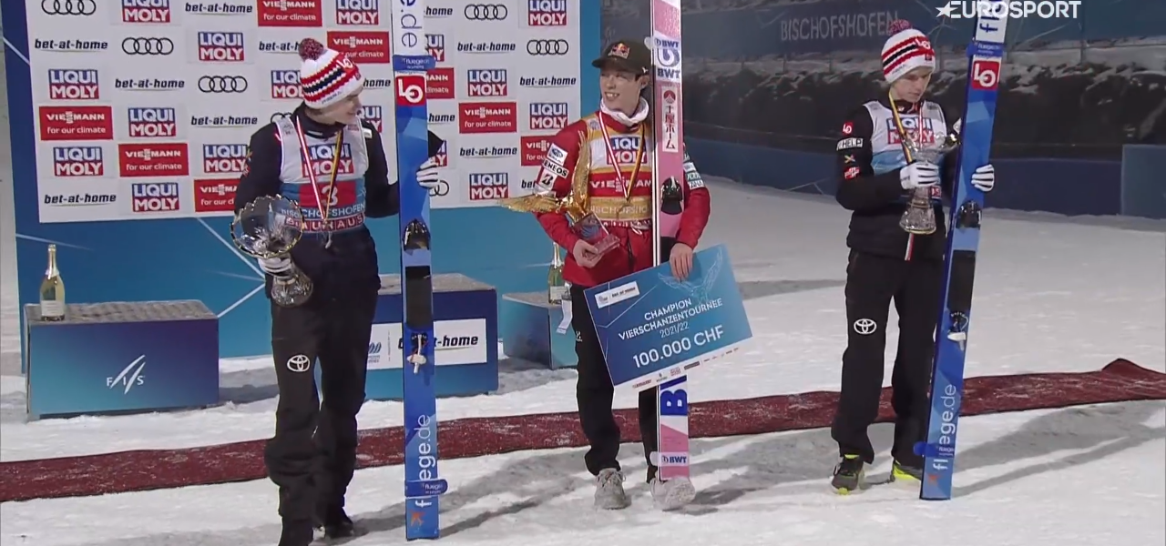 W Klasyfikacji Końcowej Jubileuszowego 70.Turnieju w sezonie Olimpijskim Ryoyu Kobayashi z rekordową notą 1162.3 pokonał o ponad 20 punktów Mariusa Lindvika, który po 1 serii dzisiaj był w kłopotach, ale odpowiedział w drugiej próbie. Na najniższym stopniu podium w Turnieju Halvor Egner Granerud, który rok temu bardzo przeżył 4 miejsce.
