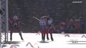 Od początku ostatniego podbiegu pod skocznię najmocniej ruszyli Jarl Magnus RIIBER, Jens Luraas OFTEBRO i Vinzenz GEIGER. Do końca podbiegu w kontakcie z nimi pozostał Ilkka HEROLA, ale Johannes LAMPARTER stracił sporo i odpadł z walki jeszcze przed ostatnim finiszem.